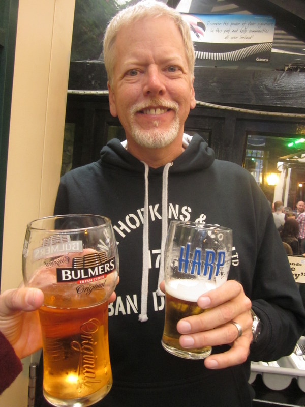 A pint of cider and one of Harp, at the Brazen Head.
