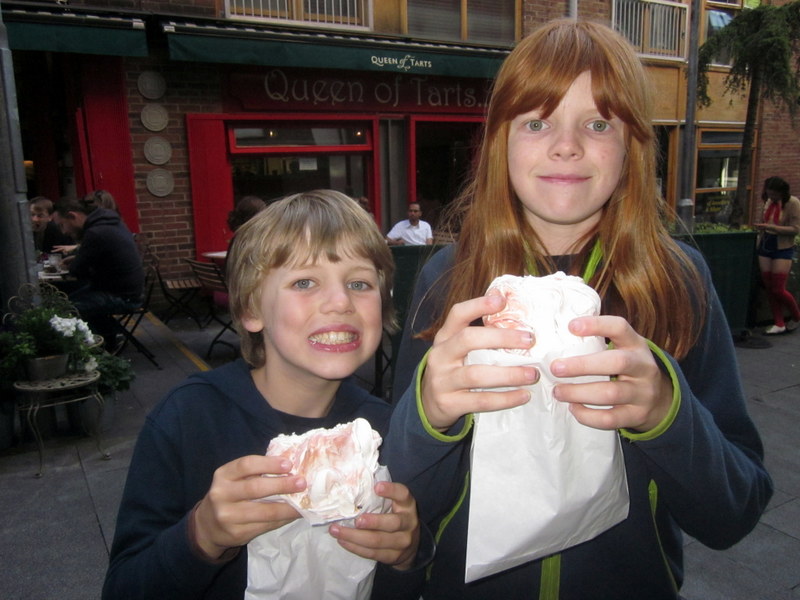 As we walked around Dublin, we kept catching glimpses of giant meringues in the windows of bakeries, and knew we had to try them out. It was towards the end of the our last day, but it was worth it. It's kind of hard to see in this picture but those really are enormous meringues (that the kids are holding in white paper bags). You may have noticed that they are streaked with pink - that's because they were (intensely!) raspberry flavored. What you really can't see in the picture is that they were delicious!