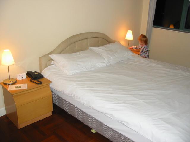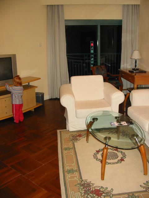 Next, she turned the tv on and off a few times (fewer than 400). The TV has three English channels (CCTV 9, CNN Asia, and HBO Asia), a handful of mostly sports channels, and 50 that show period soap operas. Since we've been here we've seen one dubbed episode of Junkyard Wars and Casablanca, among other things.