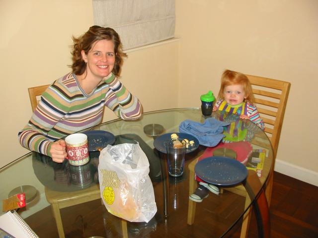 After a few days, Alison and Cielo made a brave journey to ee-Key-uh (Ikea) in the Southwest part of Shanghai and bought some pans, plates, utensils, napkins, and bowls (all for less than $100). The next day, we had our first home-cooked meal. (Yes, Cielo will be sitting on a phone book for her meals for 8 weeks. (She's sitting on the Chinese-language phone book; the English language phone book for Shanghai is only half an inch thick)).
