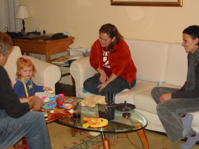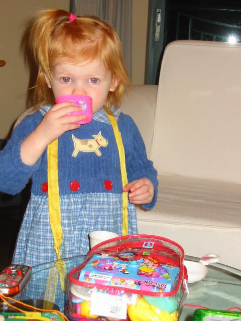 Not only did she get to blow out candles, which she has been itching to do since a rash of other two-year-olds' parties in January, Cielo also got a nice Pooh bag, some socks, a monkey, a toy cell phone, and a bag of assorted play dishes and pans (which she calls a "party" - for "tea party").