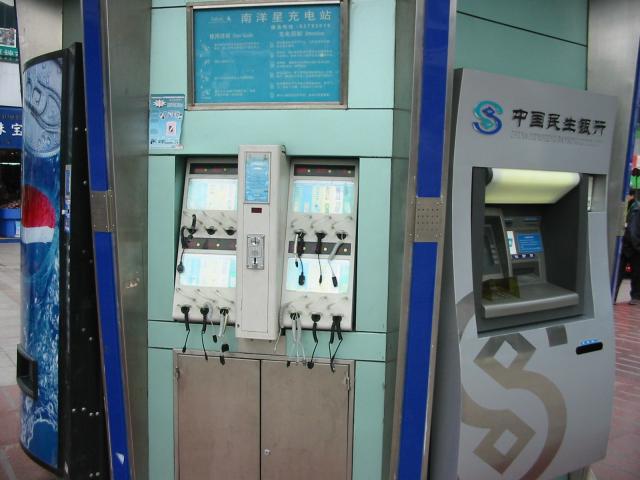 In all of the train stations, there are these power vending machines. You put some money in, and plug your cell phone into the charger cord that matches your phone, and you're ready to go again!