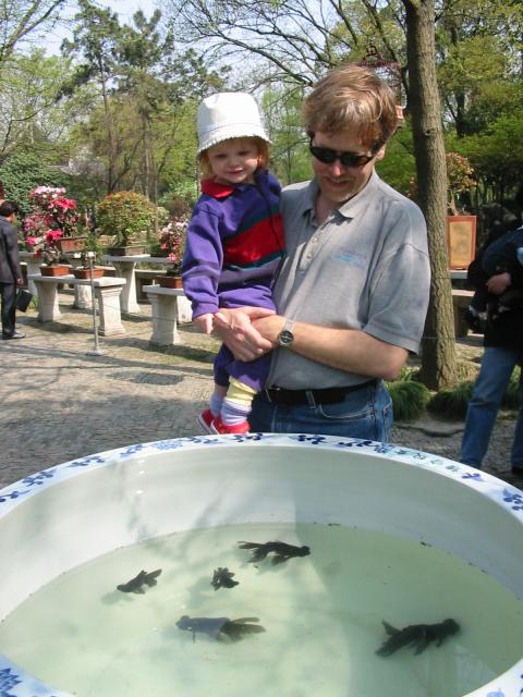 And Vernon and Cielo peering at one of the several large bowls of different fish in the Humble Administrator's Garden.