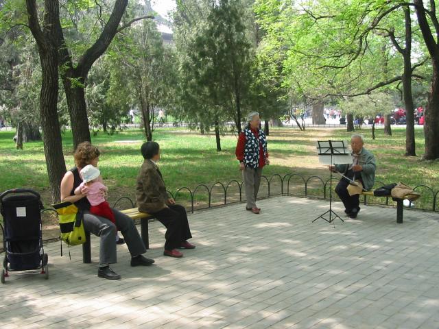 Outside the Temple of Heaven, which we didn't go into, there's a nice public park (admission less than a dollar). Inside, many people do Tai Ji, sword practice, ballroom dancing, flying kites, playing badminton, and practicing on musical instruments and singing. Here's a couple working together on their singing and playing, respectively.