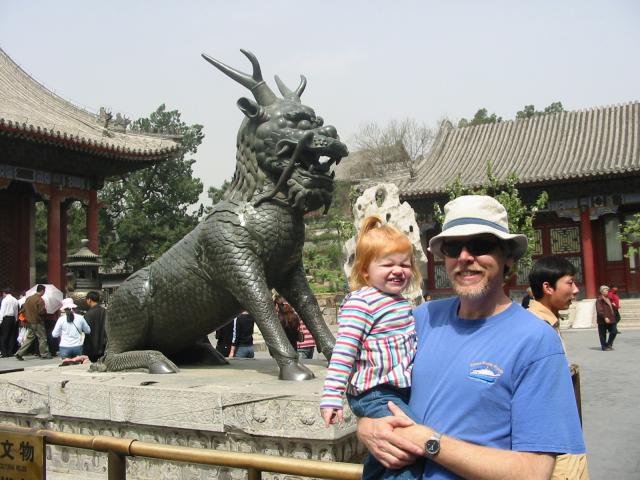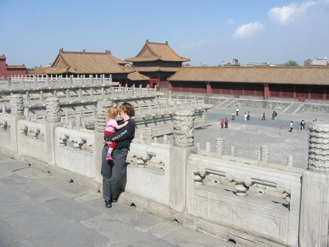 After the Forbidden City, Cielo takes a ride on Vernon's shoulders, with Nana in the background. You almost never see young Chinese children riding on parents' shoulders, because most of them wear (several layers of) split-bottom pants, through which they can pee or poop freely. You don't want that on your shoulders.