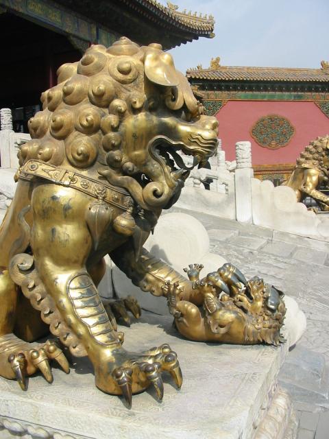 This is the only gold-colored lion we saw in China. Pretty much all lions come in pairs, with the female on the right (as you face out from the building), almost always with a baby lion, and the male on the left. This is a pretty good close-up of a female and baby. The metal instead of stone resulted in really nice sharp claws.