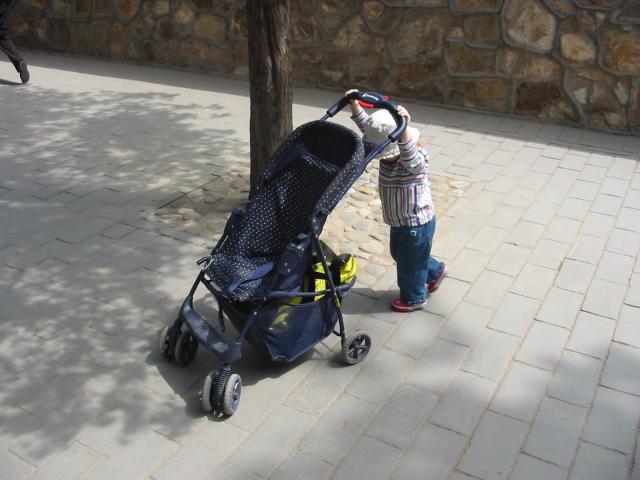 Cielo, like many toddlers, enjoys pushing her own stroller. During this trip, she grew tall enough to push it using the handles instead of pushing the storage basket underneath.