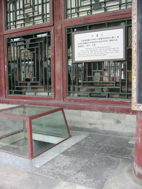 The heating system at the Summer Palace worked by having tunnels under the buildings in which coal was burned. The glass box is covering one of the access tunnels.