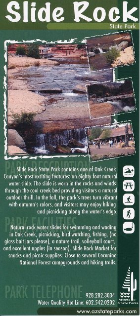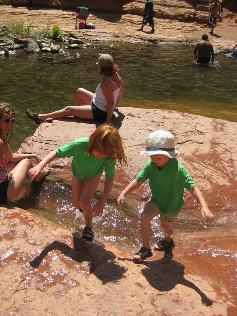The place is called Slide Rock because there's a seventy foot long section where the water has smoothed the rocks, and a kind of moss has grown over the rock, making it very slippery (there are sections like this where you're not supposed to or ready to slide where the footing is very tricky). Alison and Cielo both went down the slide - here is Cielo just before and just after she passed Alison, who had the camera.