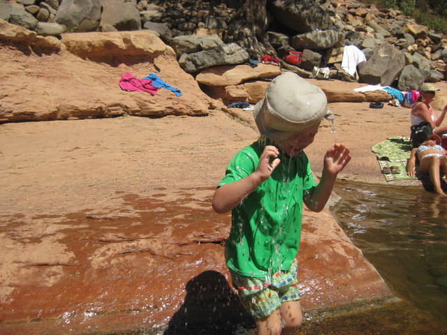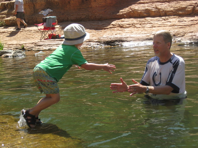 The most fun was repeatedly jumping in to the water. Here's Eero making the leap from that shelf out to a deeper part where Vernon is standing.