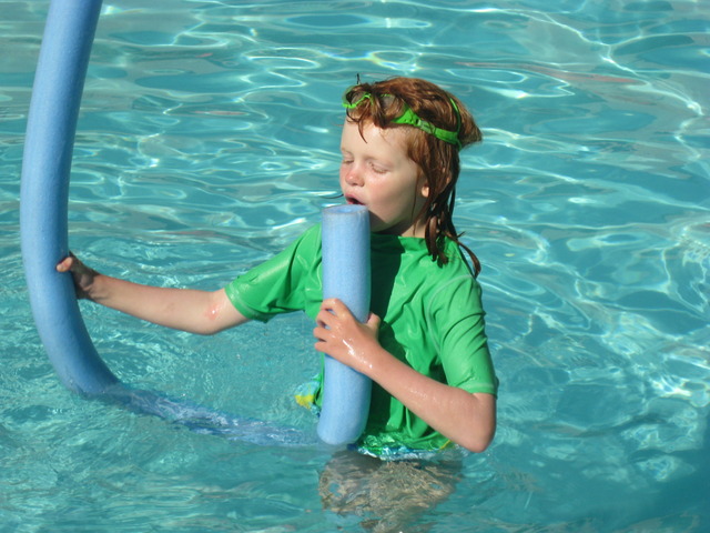 Cielo discovered you could blow in one end of a noodle and water would spray out of the other end.