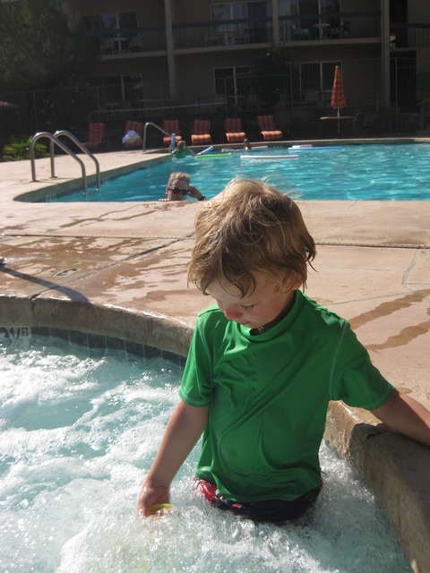 Eero and Alison often went in the hotel hot tubs together. Here's Eero, then Vernon behind him, and Cielo still blowing into a noodle way in the back.